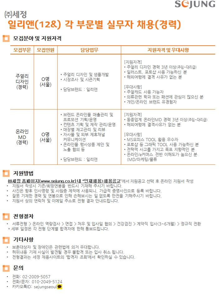 (주)세정 일리앤(12&) 각 부문별 실무자 채용(경력)