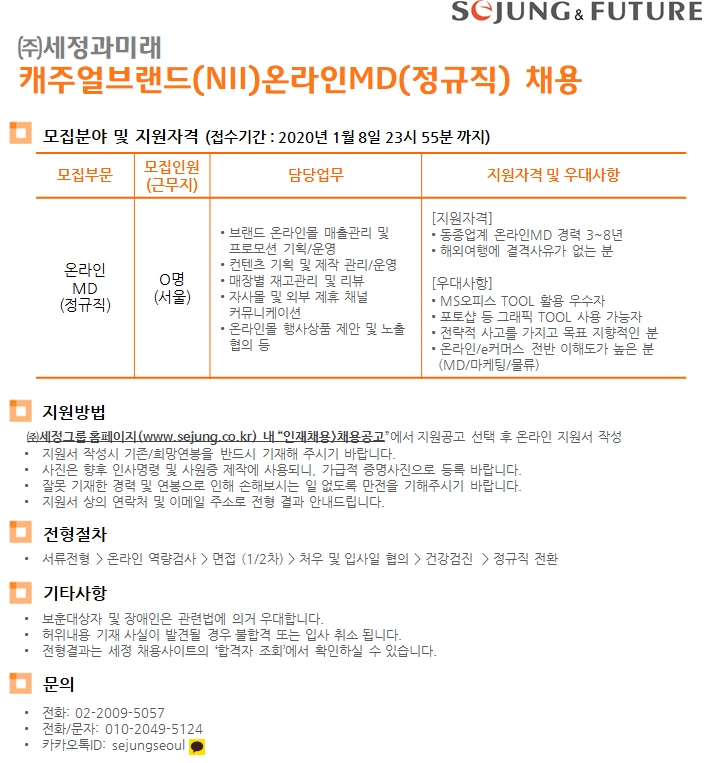 (주)세정과미래 캐주얼브랜드(NII)온라인MD(정규직) 채용